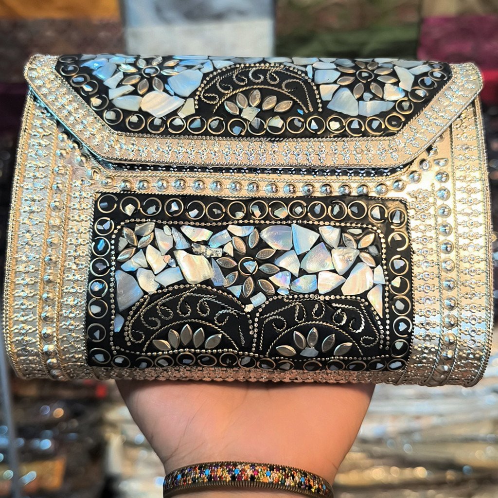 - Design: Ethnic Handmade Brass Metal Clutch with Stone Mosaic Work