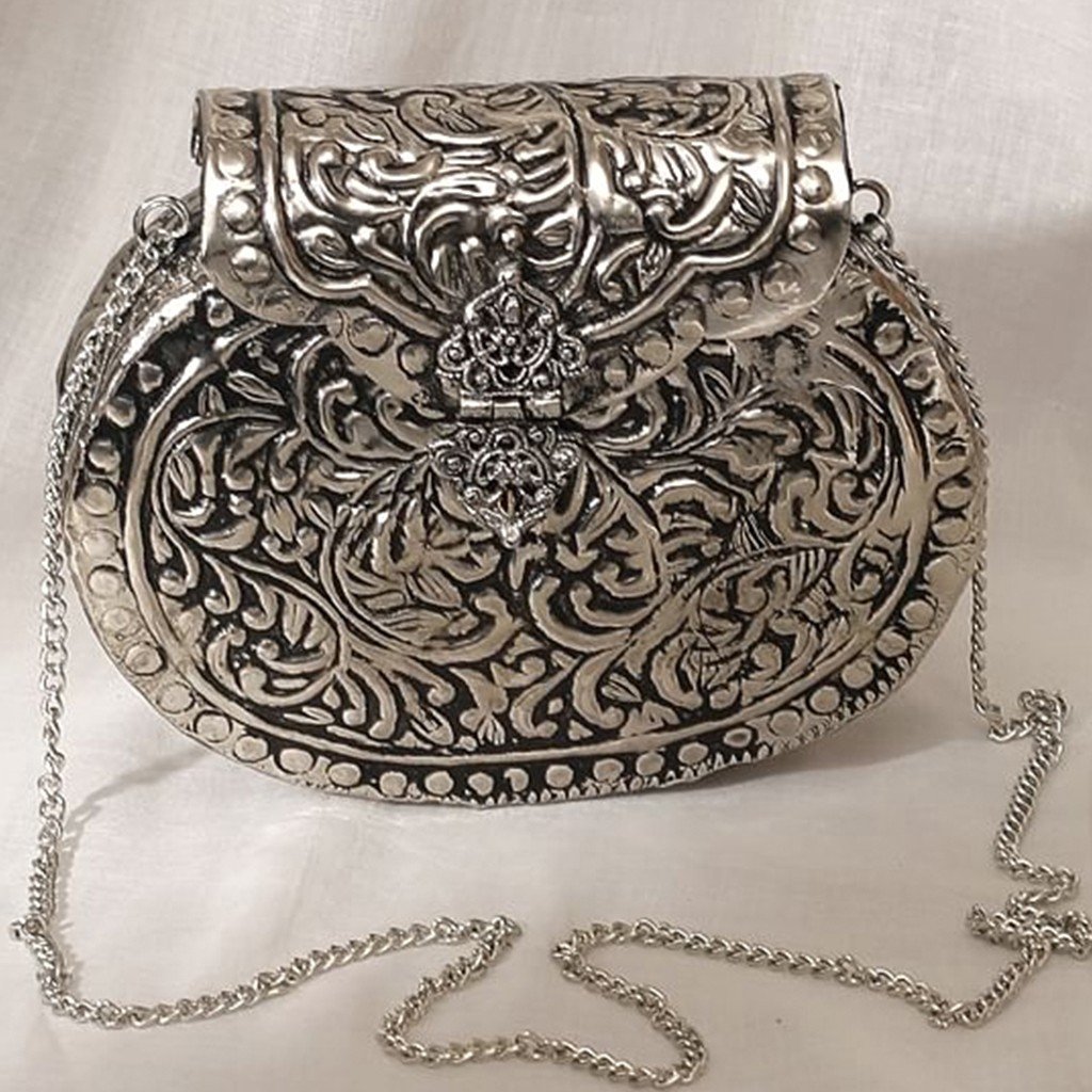 Each bag is meticulously handcrafted from premium Silver metal, featuring intricate hand-hammered engravings that reflect traditional patterns and fine detailing. The vintage silver-tone finish adds a regal touch, making it a perfect statement piece for weddings, parties, and festive occasions.