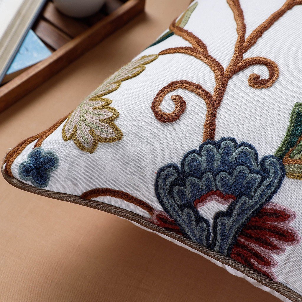 White Aari Hand Embroidered Cotton Duck Cushion Cover | 16 x 16 Inch | Kashmiri Artisan Craft