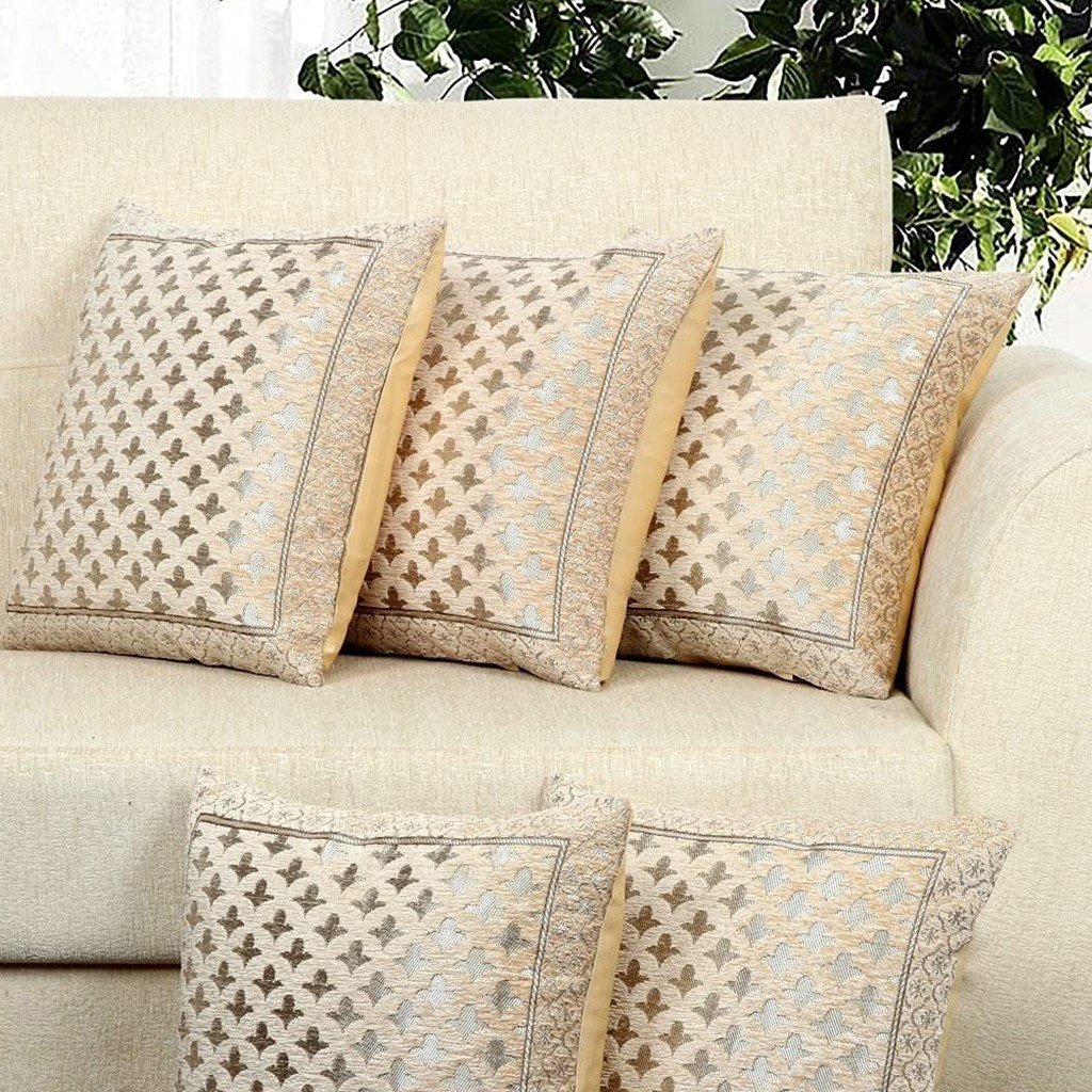 This set of 5 cushion covers, woven with precision using premium chenille fabric (240 TC), features intricate ethnic star motifs and a subtle beige hue that complements all interior themes. The jacquard weave ensures rich texture, durability, and a soft, comfortable feel against your skin.