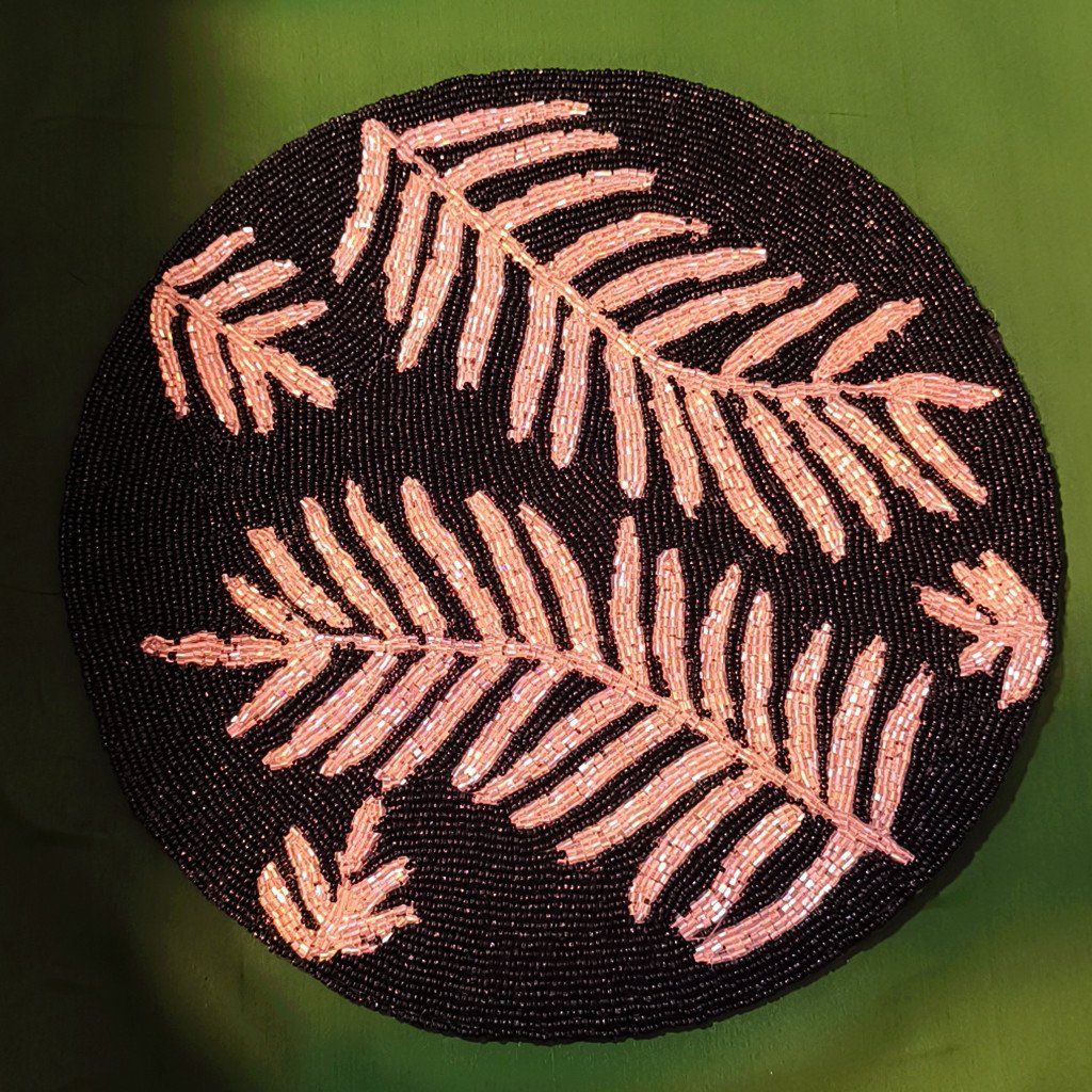 Handmade Beaded Placemats – Black & Gold Leaf Table Decor (13 inch)